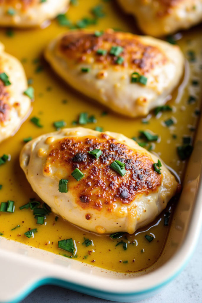- Bake uncovered for 18–22 minutes, or until the internal temperature reaches 165°F (74°C) and juices run clear. Spoon garlic butter from the pan over the chicken before serving.